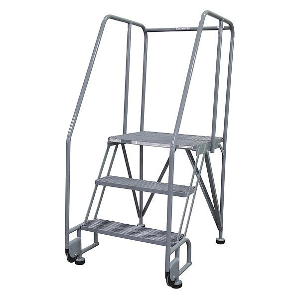 60 in H Steel Tilt and Roll Ladder, 3 StepsSKU G9817455Categories Material HandlingDescription Tilt and Roll Ladder, Material Steel, Platform Height 30 in, Handrails Included Yes, Handrail Height 30 in, Overall Height 60 in, Number of Steps 3, Assembled, Load Capacity 350 lb, Step Tread Serrated, Platform Depth 20 in, Platform Width 24 in, Bottom Width 28 in, Base Depth 41 in, Overall Width 28 in, Climbing Angle 59 Degrees , Step Depth 7 in, Step Width 24 in, Ladder Actuation None, Finish Powder Coated, Color Gray, Standards ANSI, OSHA, Includes 2-1/2 in Rubber Pads, Rear Exit NograingerSKU: 3FME8, mscSKU: , zoro_no: G9817455, mongo_id: 65bbe8ef22d7a989a9925035