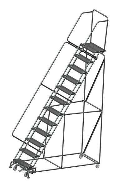 133 in H Steel Rolling Ladder, 10 StepsSKU G5206909Categories Material HandlingDescription Rolling Ladder, Material Steel, Platform Height 100 in, Handrails Included Yes, Handrail Height 30 in, Overall Height 133 in, Number of Steps 10, Assembled, Load Capacity 450 lb, Step Tread Expanded Metal, Platform Depth 21 in, Platform Width 24 in, Bottom Width 32 in, Base Depth 81 in, Overall Width 32 in, Climbing Angle 59 Degrees , Step Depth 7 in, Step Width 24 in, Ladder Actuation Weight Activated Step Lock, Finish Powder Coated, Color Gray, Standards ANSI, OSHAgraingerSKU: 41LG14, mscSKU: , zoro_no: G5206909, mongo_id: 65bbe8ef22d7a989a9925019