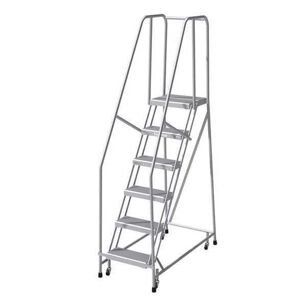SKU G1000295Categories Material HandlingDescription Rolling Ladder, Material Aluminum, Platform Height 60 in, Handrails Included Yes, Handrail Height 30 in, Overall Height 90 in, Number of Steps 6, Assembled, Load Capacity 350 lb, Step Tread Ribbed, Platform Depth 14 in, Platform Width 16 in, Bottom Width 24 in, Base Depth 50 in, Overall Width 24 in, Climbing Angle 59 Degrees , Step Depth 7 in, Step Width 16 in, Ladder Actuation Weight Activated Step Lock, Finish Aluminum Acid Brightened, Color Natural, Standards ANSI, OSHA, Rear Exit NograingerSKU: 21VE82, mscSKU: , zoro_no: G1000295, mongo_id: 65bbe8c922d7a989a9916919