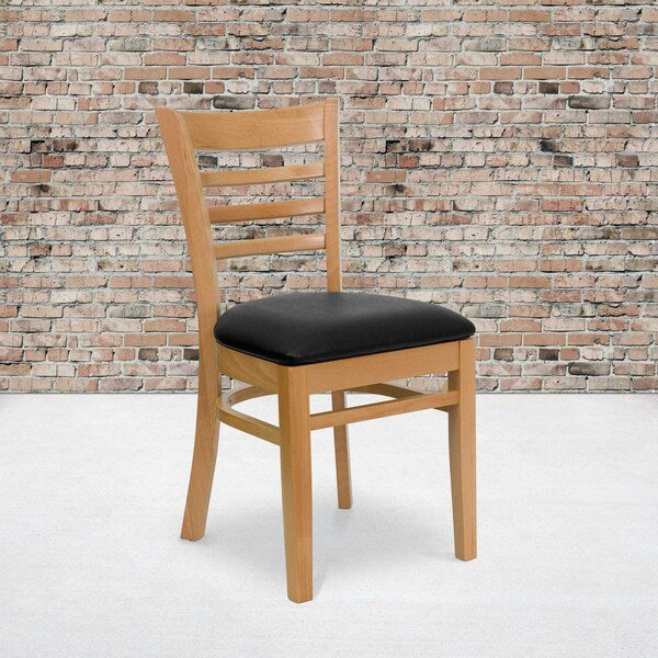 Ladder Back Natural Wood Restaurant Chair, Black Vinyl Seat, PK2