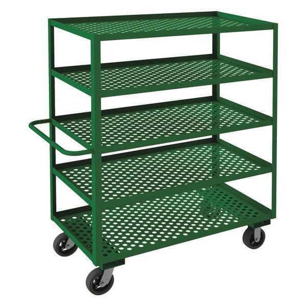 SKU G2247500Categories Material HandlingDescription Flow-Through Utility Cart with Perforated Lipped Metal Shelves, Load Capacity 2,000 lb, Steel Material, 12 ga Gauge, Powder Coated Finish, Green Color, Overall Length 52 in, Overall Width 24 1/2 in, Number of Shelves 5, Capacity per Shelf 400 lb, Distance Between Shelves 11 3/8 in, Shelf Length 48 in, Shelf Width 24 in, Handle Height 36 1/2 in, Top Shelf Height 63 in, Assembled/Unassembled AssembledgraingerSKU: 19C138, mscSKU: , zoro_no: G2247500, mongo_id: 65bbe81b22d7a989a98da24c
