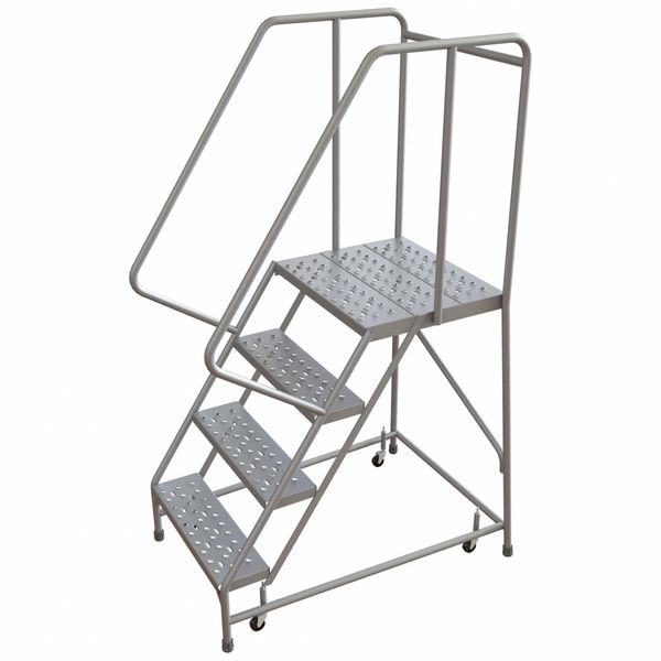 SKU G606904563Categories Material HandlingDescription Rolling Ladder, Material Aluminum, Platform Height 40 in, Handrails Included Yes, Overall Height 72 in, Number of Steps 4, Assembled, Load Capacity 350 lb, Step Tread Perforated, Platform Depth 21 in, Platform Width 24 in, Bottom Width 32 in, Base Depth 37 in, Climbing Angle 56 Degrees , Step Width 24 in, Ladder Actuation Spring Loaded Casters, Color Silver, Rear Exit NograingerSKU: 799ZJ1, mscSKU: , zoro_no: G606904563, mongo_id: 65bbe8289a749db8227794ef