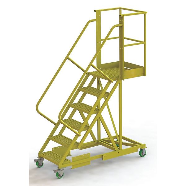 SKU G9958243Categories Material HandlingDescription Supported, Cantilever Rolling Ladder, Material Steel, Unassembled, Handrails Included Yes, Platform Height 60 in, Platform Width 24 in, Platform Depth 20 in, Overall Height 102 in, Load Capacity 300 lb, Handrail Height 42 in, Bottom Width 41 in, Base Depth 72 in, Number of Steps 6, Climbing Angle 50 Degrees , Ladder Actuation Locking Casters, Step Depth 8 1/2 in, Step Width 24 in, Step Tread Perforated, Finish Powder Coated, Color Yellow, Standards OSHA 1910.29 and ANSI A14.7graingerSKU: 15E949, mscSKU: , zoro_no: G9958243, mongo_id: 65bbe8289a749db8227794cc