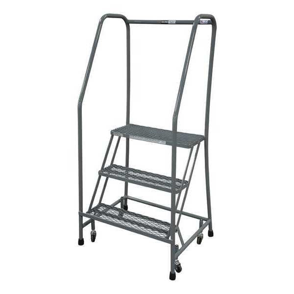$449.99 / eachWeb price60 in H Steel Rolling Ladder, 3 StepsSKU G0998000Categories Material HandlingDescription Rolling Ladder, Material Steel, Platform Height 30 in, Handrails Included Yes, Handrail Height 30 in, Overall Height 60 in, Number of Steps 3, Unassembled, Load Capacity 450 lb, Step Tread Expanded Metal, Platform Depth 10 in, Platform Width 24 in, Bottom Width 31 in, Base Depth 43 in, Overall Width 30 in, Climbing Angle 59 Degrees , Step Depth 7 in, Step Width 24 in, Ladder Actuation Weight Activated Step Lock, Finish Powder Coated, Color Gray, Standards ANSI, OSHA, Rear Exit NograingerSKU: 21UV63, mscSKU: , zoro_no: G0998000, mongo_id: 65bbe8289a749db822779512