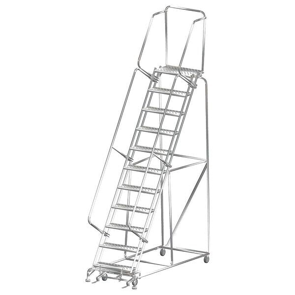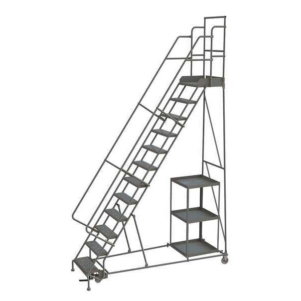 $2,183.74 / eachWeb price156 in H Steel Stock Picking Rolling Ladder, 12 StepsSKU G9900256Categories Material HandlingDescription Stock Picking Rolling Ladder, Material Steel, Platform Height 120 in, Handrails Included Yes, Handrail Height 36 in, Overall Height 156 in, Number of Steps 12, Unassembled, Load Capacity 450 lb, Step Tread Perforated, Platform Depth 20 in, Platform Width 24 in, Bottom Width 35 in, Base Depth 99 in, Overall Width 35 in, Climbing Angle 56 Degrees , Step Depth 7 in, Step Width 24 in, Ladder Actuation Foot Activated Step Lock, Finish Powder Coated, Color Gray, Standards ANSI, OSHAgraingerSKU: 31DW34, mscSKU: , zoro_no: G9900256, mongo_id: 65bbe6903aaddbd5a903b4e0