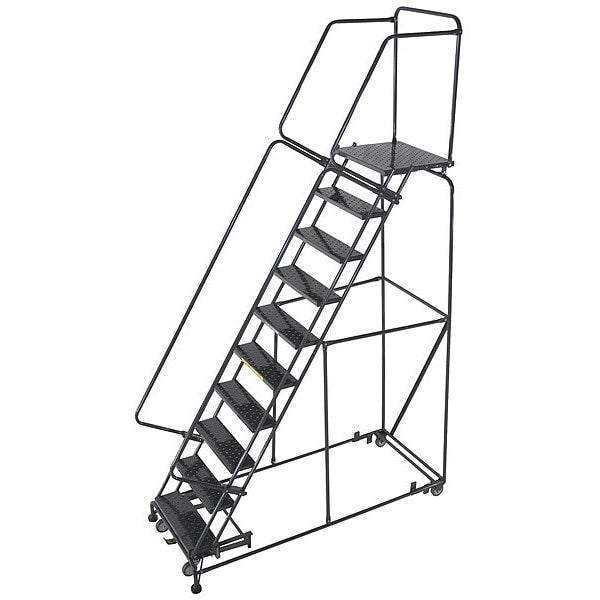 $1,851.24 / eachWeb price136 in H Steel Rolling Ladder, 10 StepsSKU G9939352Categories Material HandlingDescription Rolling Ladder, Material Steel, Platform Height 100 in, Handrails Included Yes, Handrail Height 36 in, Overall Height 136 in, Number of Steps 10, Unassembled, Load Capacity 450 lb, Step Tread Perforated, Platform Depth 20 in, Platform Width 24 in, Bottom Width 35 in, Base Depth 86 in, Overall Width 35 in, Climbing Angle 56 Degrees , Step Depth 7 in, Step Width 24 in, Ladder Actuation Foot Activated Step Lock, Finish Powder Coated, Color Gray, Standards ANSI, OSHA, Includes 2-1/2 in Rubber PadsgraingerSKU: 1CJH3, mscSKU: , zoro_no: G9939352, mongo_id: 65bbe6903aaddbd5a903b4d1