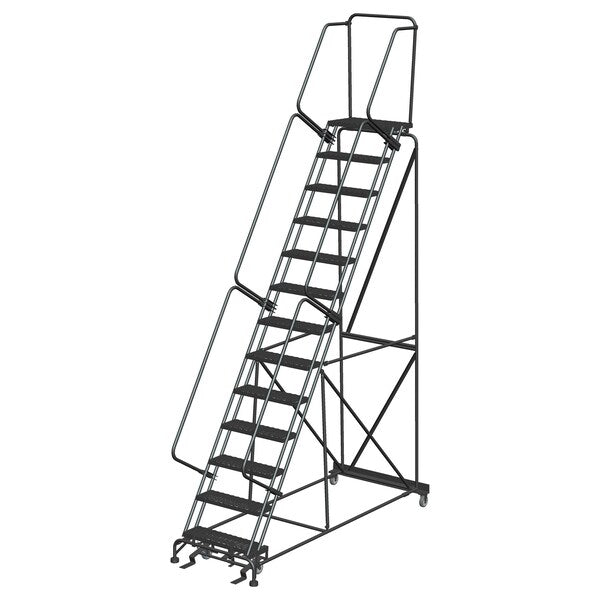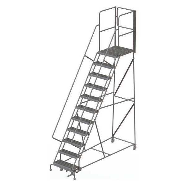 $3,139.99 / eachWeb price152 in H Steel Rolling Ladder, 11 StepsSKU G3374056Categories Material HandlingDescription Rolling Ladder, Material Steel, Platform Height 110 in, Handrails Included Yes, Handrail Height 42 in, Overall Height 152 in, Number of Steps 11, Unassembled, Load Capacity 450 lb, Step Tread Serrated, Platform Depth 30 in, Platform Width 24 in, Bottom Width 35 in, Base Depth 103 in, Overall Width 35 in, Climbing Angle 56 Degrees , Step Depth 7 in, Step Width 24 in, Ladder Actuation Foot Activated Step Lock, Finish Powder Coated, Color Gray, Standards ANSI, OSHA, Includes Rear-Exit GategraingerSKU: 45FF70, mscSKU: , zoro_no: G3374056, mongo_id: 65bbe8a322d7a989a9908477