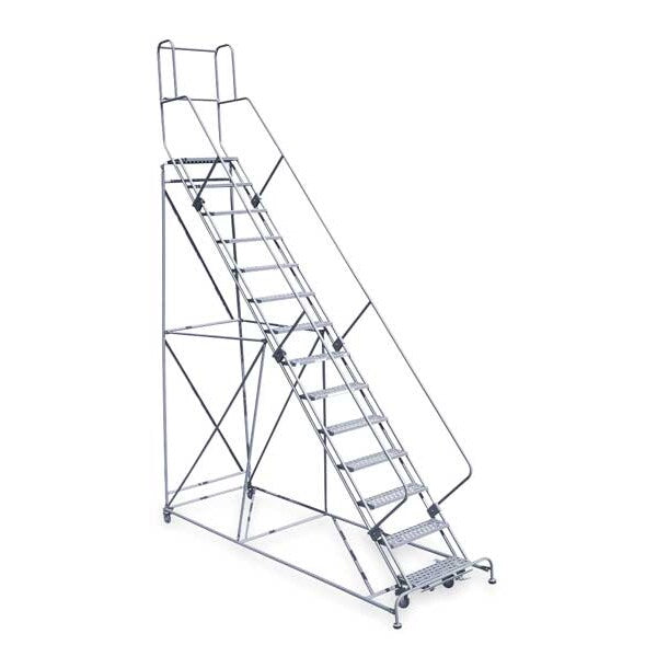 SKU G3489145Categories Material HandlingDescription Rolling Ladder, Material Steel, Platform Height 140 in, Handrails Included Yes, Handrail Height 42 in, Overall Height 182 in, Number of Steps 14, Unassembled, Load Capacity 450 lb, Step Tread Serrated, Platform Depth 30 in, Platform Width 24 in, Bottom Width 44 in, Base Depth 198 in, Overall Width 44 in, Climbing Angle 59 Degrees , Step Depth 7 in, Step Width 24 in, Ladder Actuation Foot Activated Step Lock, Finish Powder Coated, Color Gray, Standards ANSI, OSHA, Rear Exit NograingerSKU: 21VA11, mscSKU: , zoro_no: G3489145, mongo_id: 65bbe8a322d7a989a99084c6