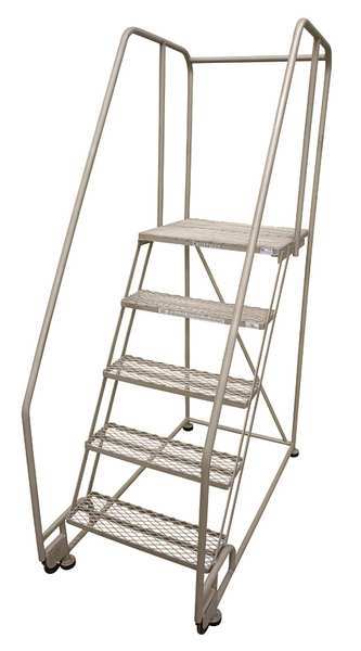 $699.99 / eachWeb price80 in H Steel Tilt and Roll Ladder, 5 StepsSKU G9930103Categories Material HandlingDescription Tilt and Roll Ladder, Material Steel, Platform Height 50 in, Handrails Included Yes, Handrail Height 30 in, Overall Height 80 in, Number of Steps 5, Assembled, Load Capacity 450 lb, Step Tread Expanded Metal, Platform Depth 10 in, Platform Width 16 in, Bottom Width 20 in, Base Depth 43 in, Overall Width 20 in, Climbing Angle 59 Degrees , Step Depth 7 in, Step Width 16 in, Ladder Actuation None, Finish Powder Coated, Color Gray, Standards ANSI, OSHA, Includes 2-1/2 in Rubber Pads, Rear Exit NograingerSKU: 20Z370, mscSKU: , zoro_no: G9930103, mongo_id: 65bbe7fe22d7a989a98cee80