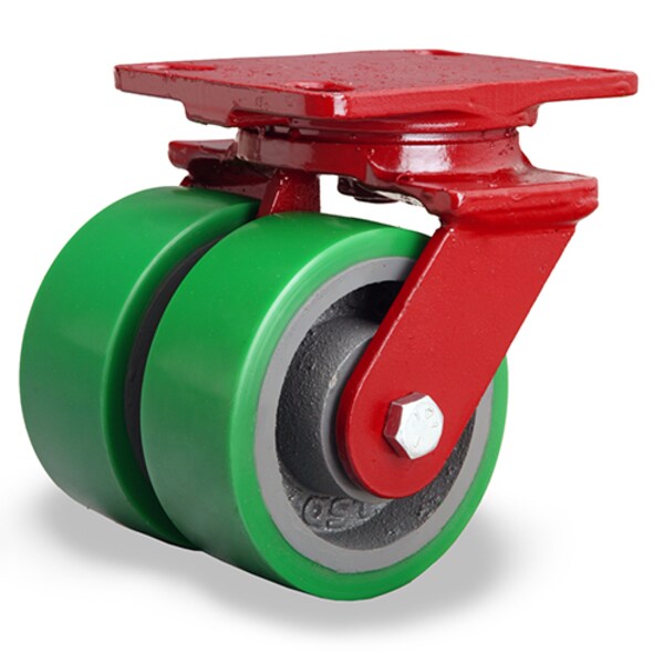 Heavy Service Dual-Wheel Swivel Caster, 5" x 2" Duralast Polyurethane (95A) on Cast Iron Wheels