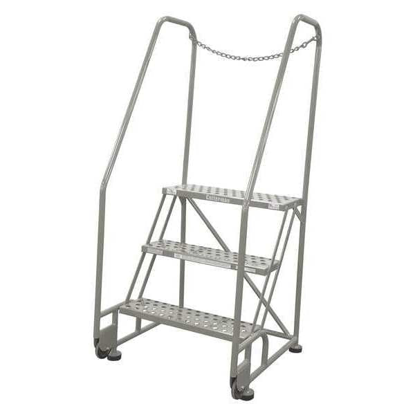 $869.99 / eachWeb price60 in H Steel Tilt and Roll Ladder, 3 StepsSKU G0639031Categories Material HandlingDescription Tilt and Roll Ladder, Material Steel, Platform Height 30 in, Handrails Included Yes, Handrail Height 30 in, Overall Height 60 in, Number of Steps 3, Assembled, Load Capacity 450 lb, Step Tread Expanded Metal, Platform Depth 10 in, Platform Width 24 in, Bottom Width 28 in, Base Depth 31 in, Overall Width 28 in, Climbing Angle 59 Degrees , Step Depth 7 in, Step Width 24 in, Ladder Actuation None, Finish Powder Coated, Color Gray, Standards ANSI, OSHA, Includes Removable Rear Chain, Rear Exit YesgraingerSKU: 21VC05, mscSKU: , zoro_no: G0639031, mongo_id: 65bbe7fe22d7a989a98cee6b