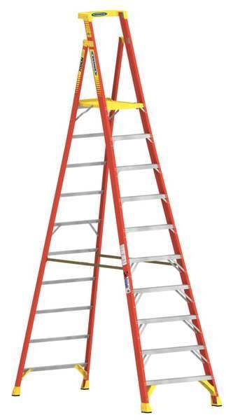 SKU G6198516Categories Material HandlingDescription Podium Stepladder, Ladder Height 13 ft, Platform Width 16 in, Platform Depth 19 1/2 in, Platform Height 9-1/2 ft, Load Capacity 300 lb, Bottom Width 38 in, Base Spread 80 1/2 in, Material Fiberglass, Series PD6200, Number of Steps 10, Step Depth 3 in, Step Tread Ribbed, Rung/Step Spacing 12 in, ANSI Type IA, Includes EDGE Bracing, Extra Large Platform with Toe Guard, Waist High Plastic Guard Rail with Slots for Accessories, Standards ANSI, Net Weight 56 lbgraingerSKU: 20KJ30, mscSKU: , zoro_no: G6198516, mongo_id: 65bbe7fe22d7a989a98cee23