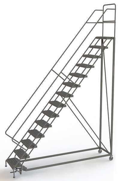 $2,631.24 / eachWeb price176 in H Steel Configurable Rolling Ladder, 14 StepsSKU G9906757Categories Material HandlingDescription Configurable Rolling Ladder, Material Steel, Platform Height 140 in, Handrails Included Yes, Handrail Height 36 in, Overall Height 176 in, Number of Steps 14, Unassembled, Load Capacity 450 lb, Step Tread Serrated, Platform Depth 17 in, Platform Width 24 in, Bottom Width 40 in, Base Depth 132 in, Overall Width 40 in, Climbing Angle 50 Degrees , Step Depth 8 1/2 in, Step Width 24 in, Ladder Actuation Foot Activated Step Lock, Finish Powder Coated, Color Gray, Standards ANSI, OSHAgraingerSKU: 29RJ48, mscSKU: , zoro_no: G9906757, mongo_id: 65bbe7fe22d7a989a98cee47
