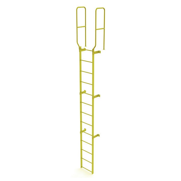 $1,197.49 / eachWeb price15 ft. 6" Ladder, Walk-Thru Fixed, Steel, 13-Rung, Steel, 13 Steps, Top Exit, Safety Yellow FinishSKU G2281802Categories Material HandlingDescription Fixed Ladder, Walk-Thru Included Yes, Exit Top, Overall Height 16 ft, Overall Width 28 in, Material Steel, Load Capacity 450 lb, Number of Steps 13, Top Step Height 12 ft, Rung Dia. 3/4 in, Rung/Step Spacing 12 in, Step Width 18 in, Finish Safety Yellow, Standards ANSI; OSHA Compliant, Includes 42 In. guardrails, Manufacturers Warranty Length 1 yrgraingerSKU: 231F06, mscSKU: , zoro_no: G2281802, mongo_id: 65bbe7fe22d7a989a98cee44