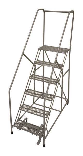 90 in H Steel Rolling Ladder, 6 StepsSKU G0997836Categories Material HandlingDescription Rolling Ladder, Material Steel, Platform Height 60 in, Handrails Included Yes, Handrail Height 30 in, Overall Height 90 in, Number of Steps 6, Assembled, Load Capacity 450 lb, Step Tread Expanded Metal, Platform Depth 24 in, Platform Width 16 in, Bottom Width 24 in, Base Depth 72 in, Overall Width 24 in, Climbing Angle 50 Degrees , Step Depth 7 in, Step Width 16 in, Ladder Actuation Foot Activated Step Lock, Finish Powder Coated, Color Gray, Standards ANSI, OSHA, Rear Exit NograingerSKU: , mscSKU: , zoro_no: G0997836, mongo_id: 65bbe6083aaddbd5a9002194