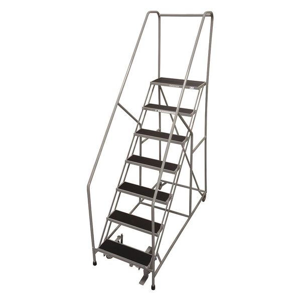 100 in H Steel Rolling Ladder, 7 StepsSKU G9852701Categories Material HandlingDescription Rolling Ladder, Material Steel, Platform Height 70 in, Handrails Included Yes, Handrail Height 30 in, Overall Height 100 in, Number of Steps 7, Assembled, Load Capacity 450 lb, Step Tread Antislip Vinyl, Platform Depth 12 in, Platform Width 24 in, Bottom Width 30 in, Base Depth 69 in, Overall Width 30 in, Climbing Angle 59 Degrees , Step Depth 7 in, Step Width 24 in, Ladder Actuation Foot Activated Step Lock, Finish Powder Coated, Color Gray, Standards ANSI, OSHA, Rear Exit NograingerSKU: , mscSKU: , zoro_no: G9852701, mongo_id: 65bbe6083aaddbd5a900219f