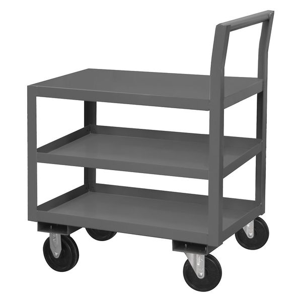 SKU G2146545Categories Material HandlingDescription Low-Profile Utility Cart with Lipped & Flush Metal Shelves, Load Capacity 1,400 lb, Steel Material, 14 ga Gauge, Powder Coated Finish, Gray Color, Overall Length 43 in, Overall Width 25 1/2 in, Number of Shelves 3, Capacity per Shelf 466 lb, Distance Between Shelves 7 5/8 in, Shelf Length 36 in, Shelf Width 24 in, Includes Raised Offset Handle, Distance Between Middle and Bottom Shelf 7 5/8 in, Distance Between Top and Middle Shelf 7 5/8 in, Handle Height 39 5/8 in, Top Shelf Height 27 5/8 ingraingerSKU: 4DKP9, mscSKU: , zoro_no: G2146545, mongo_id: 65bbe7ca9a749db822759791