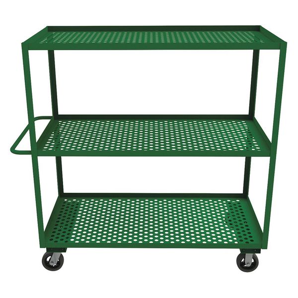 SKU G2247537Categories Material HandlingDescription Flow-Through Utility Cart with Perforated Lipped Metal Shelves, Load Capacity 1,200 lb, Steel Material, 12 ga Gauge, Powder Coated Finish, Green Color, Overall Length 66 1/4 in, Overall Width 30 1/4 in, Number of Shelves 3, Capacity per Shelf 400 lb, Distance Between Shelves 24 5/8 in, Shelf Length 60 in, Shelf Width 30 in, Distance Between Middle and Bottom Shelf 24 5/8 in, Distance Between Top and Middle Shelf 24 5/8 in, Handle Height 36 1/2 in, Top Shelf Height 60 ingraingerSKU: 19C135, mscSKU: , zoro_no: G2247537, mongo_id: 65bbe7ca9a749db822759792
