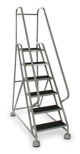 SKU G3492189Categories Material HandlingDescription Rolling Ladder, Material Steel, Platform Height 60 in, Handrails Included Yes, Handrail Height 30 in, Overall Height 90 in, Number of Steps 6, Unassembled, Load Capacity 450 lb, Step Tread Serrated, Platform Depth 30 in, Platform Width 30 in, Bottom Width 33 in, Base Depth 84 in, Overall Width 32 in, Climbing Angle 59 Degrees , Step Depth 7 in, Step Width 30 in, Ladder Actuation Foot Activated Step Lock, Finish Powder Coated, Color Gray, Standards ANSI, OSHA, Rear Exit NograingerSKU: 21UW76, mscSKU: , zoro_no: G3492189, mongo_id: 65bbe7d63aaddbd5a90bc5d6