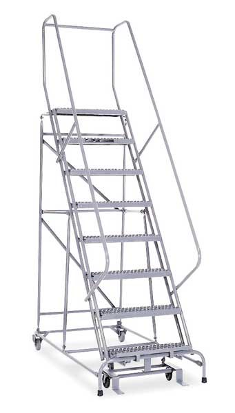 SKU G9817394Categories Material HandlingDescription Rolling Ladder, Material Stainless Steel, Platform Height 80 in, Handrails Included Yes, Handrail Height 30 in, Overall Height 110 in, Number of Steps 8, Assembled, Load Capacity 450 lb, Step Tread Serrated, Platform Depth 10 in, Platform Width 24 in, Bottom Width 32 in, Base Depth 58 in, Overall Width 32 in, Climbing Angle 59 Degrees , Step Depth 7 in, Step Width 24 in, Ladder Actuation Foot Activated Step Lock, Finish Satin Blasted, Color Natural, Standards ANSI, OSHAgraingerSKU: 3FMJ3, mscSKU: , zoro_no: G9817394, mongo_id: 65bbe7a79a749db82274e504