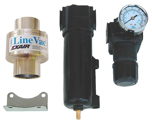 Description Vacuum Conveyor Kit, Stainless Steel, For Hose I.D. 2 in, Vacuum ID 1 3/4 in, Vacuum OD 3 1/4 in, Vacuum Length 4 3/8 in, Air Inlet Thread Size 1/4 in, Air Consumption @ 80 psi 45 scfm, Vacuum -28.5 in wc, Includes Mounting Bracket, Filter Separator, Pressure Regulator and Coupling Kit