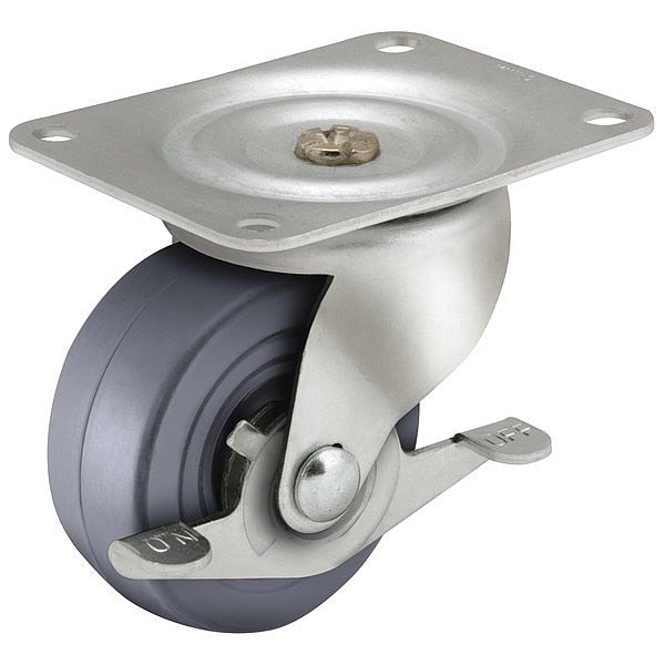 Description Swivel, Economy NSF-Listed Sanitary Plate Caster, Load Rating 175 lb, Swivel Lock Type No Lock Included, Wheel Dia. 2 1/2 in, Wheel Width 1 1/8 in, Wheel/Tread Material Rubber, Non-Marking Yes, Number of Wheels 1, Caster Brake Type Side Pedal Brake, Tread Shape Standard