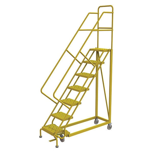 100 in H Steel Rolling Ladder, 7 StepsSKU G0997215Categories Material HandlingDescription Rolling Ladder, Material Steel, Platform Height 70 in, Handrails Included Yes, Handrail Height 30 in, Overall Height 100 in, Number of Steps 7, Assembled, Load Capacity 450 lb, Step Tread Expanded Metal, Platform Depth 10 in, Platform Width 24 in, Bottom Width 30 in, Base Depth 53 in, Overall Width 30 in, Climbing Angle 59 Degrees , Step Depth 7 in, Step Width 24 in, Ladder Actuation Foot Activated Step Lock, Finish Powder Coated, Color Yellow, Standards ANSI, OSHA, Rear Exit NograingerSKU: 21UT29, mscSKU: , zoro_no: G0997215, mongo_id: 65bbe7859a749db822740047