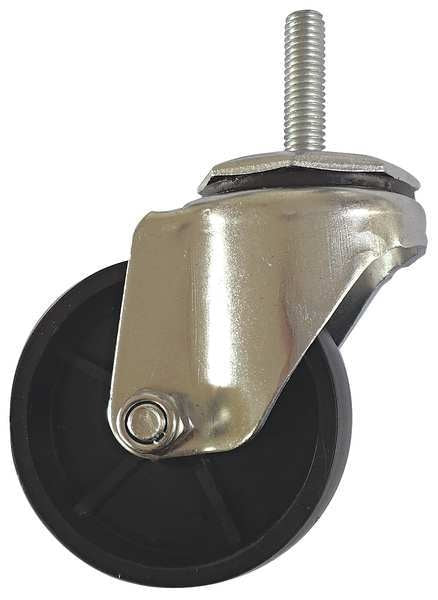 Swivel Stem Caster, Polyolfin, 3 in, 125 lb, BlkSKU G8485312Categories Material HandlingDescription General Purpose Threaded Stem Caster, Swivel Caster, 125 lb Load Rating, 0 to 299 lb, 3 in Wheel Dia., 1 in Wheel Width, Polyolefin Wheel/Tread Material, 3 5/8 in Mounting Height, Plain, 3/8 In.-16 x 1-1/2 in Caster Stem Size, Threaded, Steel Caster Frame Material, Zinc Plated Frame Finish, Yes Non-Marking, 1 Number of Wheels$6.92 / eachWeb price -