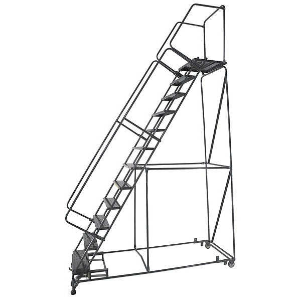 143 in H Steel Rolling Ladder, 11 StepsSKU G5205746Categories Material HandlingDescription Rolling Ladder, Material Steel, Platform Height 110 in, Handrails Included Yes, Handrail Height 30 in, Overall Height 143 in, Number of Steps 11, Unassembled, Load Capacity 800 lb, Step Tread Perforated, Platform Depth 14 in, Platform Width 24 in, Bottom Width 32 in, Base Depth 80 in, Overall Width 32 in, Climbing Angle 59 Degrees , Step Depth 7 in, Step Width 24 in, Ladder Actuation Weight Activated Step Lock, Finish Powder Coated, Color Gray, Standards ANSI, OSHAgraingerSKU: 41LH47, mscSKU: , zoro_no: G5205746, mongo_id: 65bbe7643aaddbd5a9091358