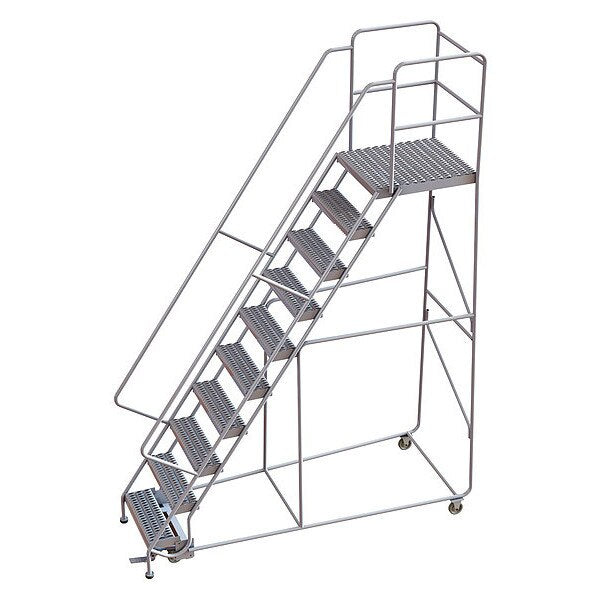 132 in H Aluminum Rolling Ladder, 10 StepsSKU G0980150Categories Material HandlingDescription Rolling Ladder, Material Aluminum, Platform Height 100 in, Handrails Included Yes, Handrail Height 32 in, Overall Height 132 in, Number of Steps 10, Assembled, Load Capacity 350 lb, Step Tread Serrated, Platform Depth 28 in, Platform Width 24 in, Bottom Width 36 in, Base Depth 93 in, Overall Width 36 in, Climbing Angle 56 Degrees , Step Depth 7 in, Step Width 24 in, Ladder Actuation Foot Activated Step Lock, Finish Aluminum Mill, Color Aluminum, Standards ANSI, OSHAgraingerSKU: 25NY65, mscSKU: , zoro_no: G0980150, mongo_id: 65bbe7643aaddbd5a9091341