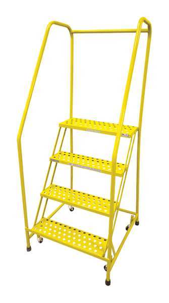 70 in H Steel Rolling Ladder, 4 StepsSKU G0996250Categories Material HandlingDescription Rolling Ladder, Material Steel, Platform Height 40 in, Handrails Included Yes, Handrail Height 30 in, Overall Height 70 in, Number of Steps 4, Assembled, Load Capacity 450 lb, Step Tread Antislip Vinyl, Platform Depth 10 in, Platform Width 24 in, Bottom Width 30 in, Base Depth 31 in, Overall Width 30 in, Climbing Angle 59 Degrees , Step Depth 7 in, Step Width 24 in, Ladder Actuation Weight Activated Step Lock, Finish Powder Coated, Color Yellow, Standards ANSI, OSHA, Rear Exit NograingerSKU: 21UP95, mscSKU: , zoro_no: G0996250, mongo_id: 65bbe75b9a749db822731b1a