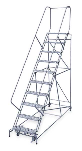 130 in H Steel Rolling Ladder, 10 StepsSKU G9930724Categories Material HandlingDescription Rolling Ladder, Material Steel, Platform Height 100 in, Handrails Included Yes, Handrail Height 30 in, Overall Height 130 in, Number of Steps 10, Unassembled, Load Capacity 450 lb, Step Tread Serrated, Platform Depth 10 in, Platform Width 16 in, Bottom Width 30 in, Base Depth 78 in, Overall Width 30 in, Climbing Angle 59 Degrees , Step Depth 7 in, Step Width 16 in, Ladder Actuation Foot Activated Step Lock, Finish Powder Coated, Color Gray, Standards ANSI, OSHA, Includes 2-1/2 in Rubber PadsgraingerSKU: 20Z288, mscSKU: , zoro_no: G9930724, mongo_id: 65bbe75b9a749db822731b28