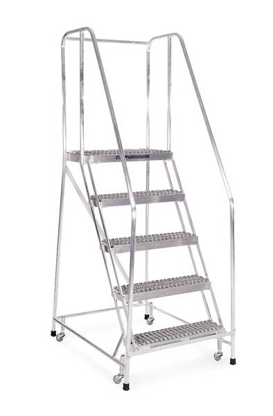 SKU G9929561Categories Material HandlingDescription Rolling Ladder, Material Steel, Platform Height 50 in, Handrails Included Yes, Handrail Height 30 in, Overall Height 80 in, Number of Steps 5, Assembled, Load Capacity 450 lb, Step Tread Serrated, Platform Depth 30 in, Platform Width 24 in, Bottom Width 30 in, Base Depth 60 in, Overall Width 30 in, Climbing Angle 59 Degrees , Step Depth 7 in, Step Width 24 in, Ladder Actuation Foot Activated Step Lock, Finish Powder Coated, Color Gray, Standards ANSI, OSHA, Includes 1 in Crutch TipsgraingerSKU: 20Z425, mscSKU: , zoro_no: G9929561, mongo_id: 65bbe75b9a749db822731b20