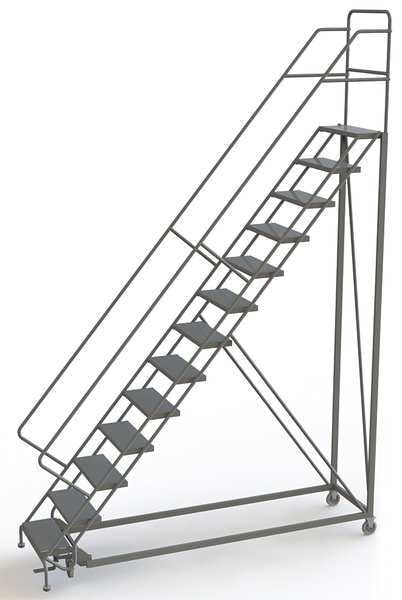 166 in H Steel Configurable Rolling Ladder, 13 StepsSKU G9906705Categories Material HandlingDescription Configurable Rolling Ladder, Material Steel, Platform Height 130 in, Handrails Included Yes, Handrail Height 36 in, Overall Height 166 in, Number of Steps 13, Unassembled, Load Capacity 450 lb, Step Tread Perforated, Platform Depth 17 in, Platform Width 24 in, Bottom Width 40 in, Base Depth 124 in, Overall Width 40 in, Climbing Angle 50 Degrees , Step Depth 8 1/2 in, Step Width 24 in, Ladder Actuation Foot Activated Step Lock, Finish Powder Coated, Color Gray, Standards ANSI, OSHAgraingerSKU: 29RJ57, mscSKU: , zoro_no: G9906705, mongo_id: 65bbe75b9a749db822731ad4