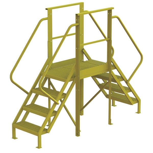 SKU G2603069Categories Material HandlingDescription Crossover Bridge, Vertical Clearance 38 in, Span 30 in, Platform Height 40 in, Platform Depth 30 in, Number of Steps 4, Bottom Width 30 in, Load Capacity 1,000 lb, Overall Span 30 in, Overall Height 82 in, Handrail Height 42 in, Climbing Angle 50 Degrees , Step Tread Serrated, Step Width 24 in, Step Depth 10 in, Material Steel, Finish Powder Coated Yellow, Color Yellow, Standards OSHAgraingerSKU: 7CY78, mscSKU: , zoro_no: G2603069, mongo_id: 65bbe75b9a749db822731ae7
