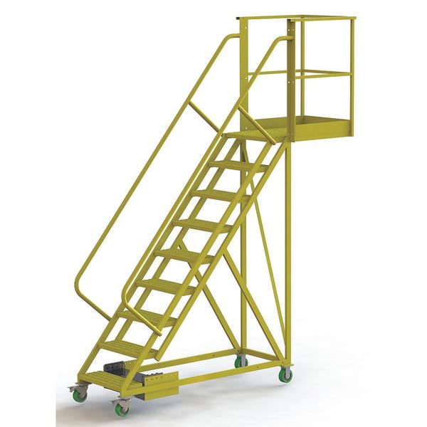 130 in H Steel Rolling Ladder, 10 StepsSKU G3491391Categories Material HandlingDescription Rolling Ladder, Material Steel, Platform Height 100 in, Handrails Included Yes, Handrail Height 30 in, Overall Height 130 in, Number of Steps 10, Unassembled, Load Capacity 450 lb, Step Tread Serrated, Platform Depth 30 in, Platform Width 24 in, Bottom Width 33 in, Base Depth 132 in, Overall Width 32 in, Climbing Angle 59 Degrees , Step Depth 7 in, Step Width 24 in, Ladder Actuation Foot Activated Step Lock, Finish Powder Coated, Color Yellow, Standards ANSI, OSHA, Rear Exit NograingerSKU: 21UX77, mscSKU: , zoro_no: G3491391, mongo_id: 65bbee24526e052139af0a7f
