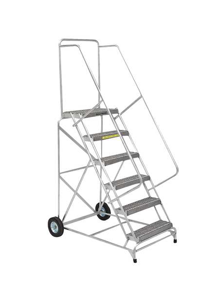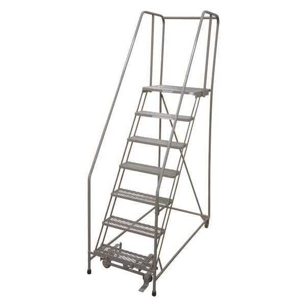 SKU G9863122Categories Material HandlingDescription Rolling Ladder, Material Steel, Platform Height 70 in, Handrails Included Yes, Handrail Height 30 in, Overall Height 100 in, Number of Steps 7, Assembled, Load Capacity 450 lb, Step Tread Expanded Metal, Platform Depth 20 in, Platform Width 24 in, Bottom Width 30 in, Base Depth 63 in, Overall Width 30 in, Climbing Angle 59 Degrees , Step Depth 7 in, Step Width 24 in, Ladder Actuation Foot Activated Step Lock, Finish Powder Coated, Color Gray, Standards ANSI, OSHA, Includes Crutch TipsgraingerSKU: 5FYW7, mscSKU: , zoro_no: G9863122, mongo_id: 65bbedfe526e052139ae24b5