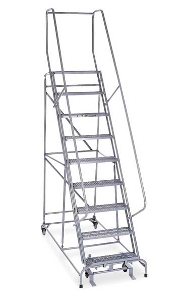 136 in H Steel Rolling Ladder, 10 StepsSKU G2232749Categories Material HandlingDescription Rolling Ladder, Material Steel, Platform Height 100 in, Handrails Included Yes, Handrail Height 36 in, Overall Height 136 in, Number of Steps 10, Unassembled, Load Capacity 450 lb, Step Tread Perforated, Platform Depth 30 in, Platform Width 24 in, Bottom Width 35 in, Base Depth 96 in, Overall Width 35 in, Climbing Angle 56 Degrees , Step Depth 7 in, Step Width 24 in, Ladder Actuation Foot Activated Step Lock, Finish Powder Coated, Color Gray, Standards ANSI, OSHA, Includes 2-1/2 in Rubber PadsgraingerSKU: 25NW81, mscSKU: , zoro_no: G2232749, mongo_id: 65bbedfe526e052139ae248f