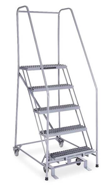 SKU G0995648Categories Material HandlingDescription Rolling Ladder, Material Steel, Platform Height 60 in, Handrails Included Yes, Handrail Height 30 in, Overall Height 90 in, Number of Steps 6, Assembled, Load Capacity 450 lb, Step Tread Expanded Metal, Platform Depth 10 in, Platform Width 24 in, Bottom Width 30 in, Base Depth 46 in, Overall Width 30 in, Climbing Angle 59 Degrees , Step Depth 7 in, Step Width 24 in, Ladder Actuation Foot Activated Step Lock, Finish Powder Coated, Color Gray, Standards ANSI, OSHA, Rear Exit YesgraingerSKU: 21UR78, mscSKU: , zoro_no: G0995648, mongo_id: 65bbea4a22d7a989a99a61e7
