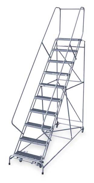 130 in H Steel Rolling Ladder, 10 StepsSKU G2169085Categories Material HandlingDescription Rolling Ladder, Material Steel, Platform Height 100 in, Handrails Included Yes, Handrail Height 30 in, Overall Height 130 in, Number of Steps 10, Assembled, Load Capacity 450 lb, Step Tread Serrated, Platform Depth 12 in, Platform Width 24 in, Bottom Width 32 in, Base Depth 97 in, Overall Width 32 in, Climbing Angle 50 Degrees , Step Depth 7 in, Step Width 24 in, Ladder Actuation Foot Activated Step Lock, Finish Powder Coated, Color Gray, Standards ANSI, OSHA, Rear Exit NograingerSKU: 3UY29, mscSKU: , zoro_no: G2169085, mongo_id: 65bbea4a22d7a989a99a61d4