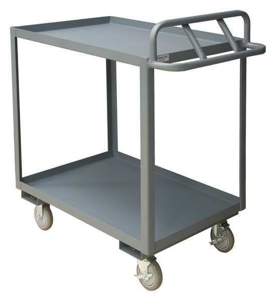 SKU G2148846Categories Material HandlingDescription Utility Cart with Lipped Metal Shelves, Load Capacity 1,200 lb, Steel Material, 14 ga Gauge, Powder Coated Finish, Gray Color, Overall Length 54 1/2 in, Overall Width 24 1/2 in, Number of Shelves 2, Capacity per Shelf 600 lb, Distance Between Shelves 26 3/4 in, Shelf Length 36 in, Shelf Width 24 in, Handle Height 43 5/8 in, Top Shelf Height 43 3/4 in, Assembled/Unassembled AssembledgraingerSKU: 49Y185, mscSKU: , zoro_no: G2148846, mongo_id: 65bbe9c522d7a989a9977f5e