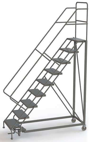 126 in H Steel Configurable Rolling Ladder, 9 StepsSKU G2229425Categories Material HandlingDescription Configurable Rolling Ladder, Material Steel, Platform Height 90 in, Handrails Included Yes, Handrail Height 36 in, Overall Height 126 in, Number of Steps 9, Unassembled, Load Capacity 450 lb, Step Tread Perforated, Platform Depth 17 in, Platform Width 24 in, Bottom Width 35 in, Base Depth 91 in, Overall Width 35 in, Climbing Angle 50 Degrees , Step Depth 8 1/2 in, Step Width 24 in, Ladder Actuation Foot Activated Step Lock, Finish Powder Coated, Color Gray, Standards ANSI, OSHAgraingerSKU: 29RJ53, mscSKU: , zoro_no: G2229425, mongo_id: 65bbe9f322d7a989a998979e