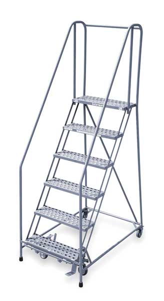 SKU G9852893Categories Material HandlingDescription Rolling Ladder, Material Steel, Platform Height 60 in, Handrails Included Yes, Handrail Height 30 in, Overall Height 90 in, Number of Steps 6, Assembled, Load Capacity 450 lb, Step Tread Antislip Vinyl, Platform Depth 10 in, Platform Width 24 in, Bottom Width 30 in, Base Depth 46 in, Overall Width 30 in, Climbing Angle 59 Degrees , Step Depth 7 in, Step Width 24 in, Ladder Actuation Foot Activated Step Lock, Finish Powder Coated, Color Gray, Standards ANSI, OSHA, Rear Exit NograingerSKU: 6ZEU3, mscSKU: , zoro_no: G9852893, mongo_id: 65bbe9cb22d7a989a997b292