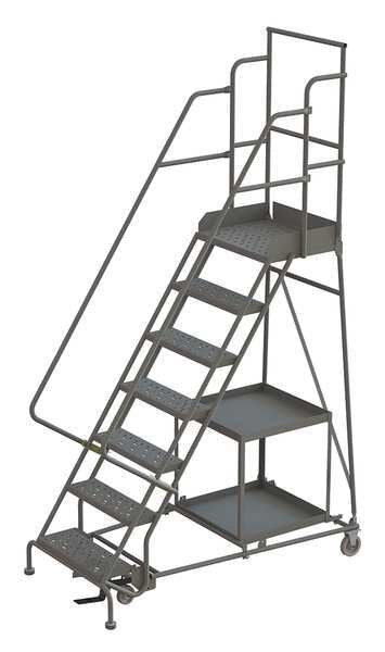 116 in H Steel Rolling Ladder, 8 StepsSKU G9904587Categories Material HandlingDescription Rolling Ladder, Material Steel, Platform Height 80 in, Handrails Included Yes, Handrail Height 36 in, Overall Height 116 in, Number of Steps 8, Unassembled, Load Capacity 600 lb, Step Tread Perforated, Platform Depth 10 in, Platform Width 24 in, Bottom Width 35 in, Base Depth 64 in, Overall Width 35 in, Climbing Angle 56 Degrees , Step Depth 7 in, Step Width 24 in, Ladder Actuation Foot Activated Step Lock, Finish Powder Coated, Color Gray, Standards ANSI, OSHA, Includes 2-1/2 in Rubber PadsgraingerSKU: 2NJV6, mscSKU: , zoro_no: G9904587, mongo_id: 65bbe9cb22d7a989a997b253