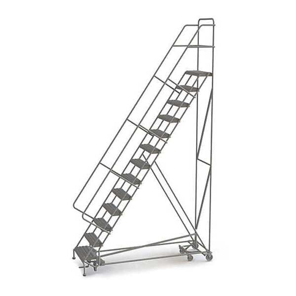 136 in H Steel Rolling Ladder, 10 StepsSKU G9957631Categories Material HandlingDescription Rolling Ladder, Material Steel, Platform Height 100 in, Handrails Included Yes, Handrail Height 36 in, Overall Height 136 in, Number of Steps 10, Unassembled, Load Capacity 450 lb, Step Tread Perforated, Platform Depth 10 in, Platform Width 24 in, Bottom Width 35 in, Base Depth 76 in, Overall Width 35 in, Climbing Angle 56 Degrees , Step Depth 7 in, Step Width 24 in, Ladder Actuation Foot Activated Step Lock, Finish Powder Coated, Color Gray, Standards ANSI, OSHA, Includes 2-1/2 in Rubber PadsgraingerSKU: 15F018, mscSKU: , zoro_no: G9957631, mongo_id: 65bbe98022d7a989a995e511