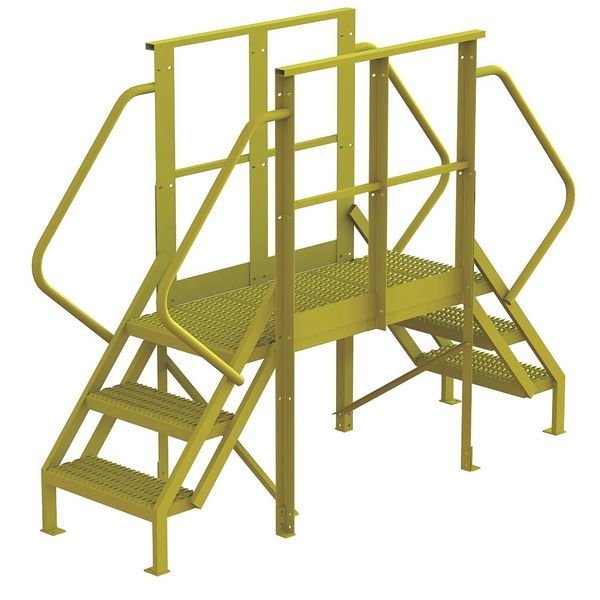 SKU G2603050Categories Material HandlingDescription Crossover Bridge, Vertical Clearance 28 in, Span 40 in, Platform Height 30 in, Platform Depth 40 in, Number of Steps 3, Bottom Width 30 in, Load Capacity 1,000 lb, Overall Span 40 in, Overall Height 72 in, Handrail Height 42 in, Climbing Angle 50 Degrees , Step Tread Serrated, Step Width 24 in, Step Depth 10 in, Material Steel, Finish Powder Coated Yellow, Color Yellow, Standards OSHAgraingerSKU: 7CY75, mscSKU: , zoro_no: G2603050, mongo_id: 65bbe98022d7a989a995e51e