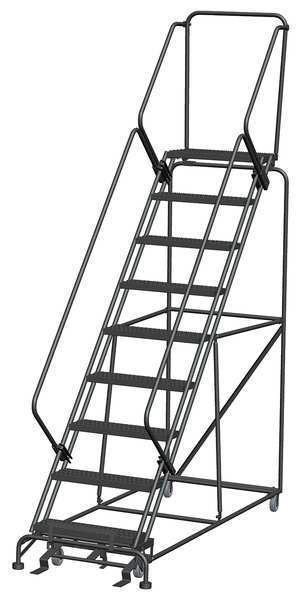 123 in H Steel Rolling Ladder, 9 StepsSKU G9839261Categories Material HandlingDescription Rolling Ladder, Material Steel, Platform Height 90 in, Handrails Included Yes, Handrail Height 30 in, Overall Height 123 in, Number of Steps 9, Unassembled, Load Capacity 450 lb, Step Tread Serrated, Platform Depth 14 in, Platform Width 24 in, Bottom Width 32 in, Base Depth 84 in, Overall Width 32 in, Climbing Angle 50 Degrees , Step Depth 7 in, Step Width 24 in, Ladder Actuation Foot Activated Step Lock, Finish Powder Coated, Color Gray, Standards ANSI, OSHAgraingerSKU: 9JGD4, mscSKU: , zoro_no: G9839261, mongo_id: 65bbe9a522d7a989a996cc2d
