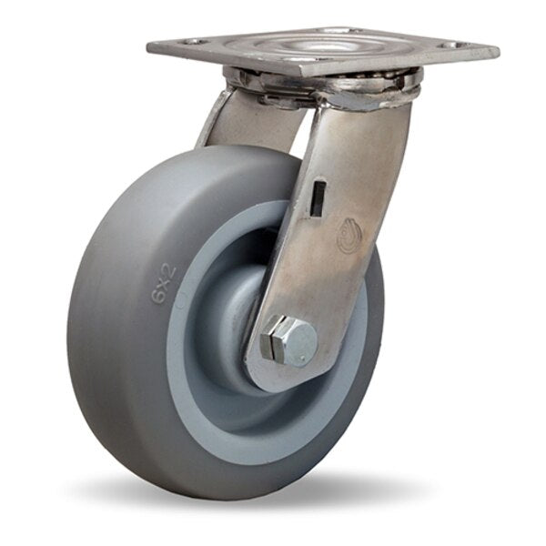 Stainless Steel Swivel Caster, 6" x 2" Versa-Tech Gray Rubber on Polyolefin Wheel, 3/4" Delrin Bearing