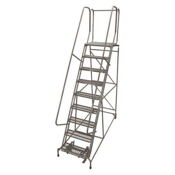 SKU G9863034Categories Material HandlingDescription Rolling Ladder, Material Steel, Platform Height 90 in, Handrails Included Yes, Handrail Height 30 in, Overall Height 120 in, Number of Steps 9, Assembled, Load Capacity 450 lb, Step Tread Serrated, Platform Depth 20 in, Platform Width 24 in, Bottom Width 32 in, Base Depth 77 in, Overall Width 32 in, Climbing Angle 59 Degrees , Step Depth 7 in, Step Width 24 in, Ladder Actuation Foot Activated Step Lock, Finish Powder Coated, Color Gray, Standards ANSI, OSHA, Includes Crutch Tips, Rear Exit NograingerSKU: 5FYX6, mscSKU: , zoro_no: G9863034, mongo_id: 65bbe7183aaddbd5a9074a84