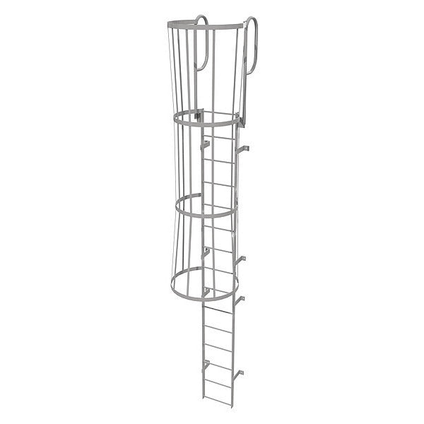 18 ft Fixed Ladder with Safety Cage, Steel, 15 Steps, Top Exit, Gray Powder Coated FinishSKU G2232408Categories Material HandlingDescription Fixed Ladder with Safety Cage, Walk-Thru Included Yes, Exit Top, Overall Height 18 ft, Overall Width 36 in, Material Steel, Load Capacity 500 lb, Number of Steps 15, Top Step Height 14 ft, Rung Dia. 3/4 in, Rung/Step Spacing 12 in, Step Width 18 in, Finish Gray Powder Coated, Standards OSHA and ANSI, Manufacturers Warranty Length 1 yr, Handrail Height 42 ingraingerSKU: 25NZ03, mscSKU: , zoro_no: G2232408, mongo_id: 65bbe7183aaddbd5a9074a2a